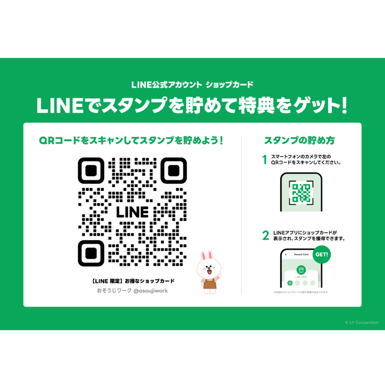 おそうじワーク をご利用いただくと、LINE限定の「ショップカード」に1ポイント付与します。 獲得ポイントごとに次の特典チケットをもれなくプレゼントします。 ☆1ポイント:春・秋 限定 10%割引 ☆2ポイント:春・秋 限定 10%割引 ★3ポイント:春・秋 限定 20%割引 リピータのお客さまにおすすめ 特別ボーナスとして、ショップカードを取得した時点で1ポイントが付与され、初回サービスから使え […]