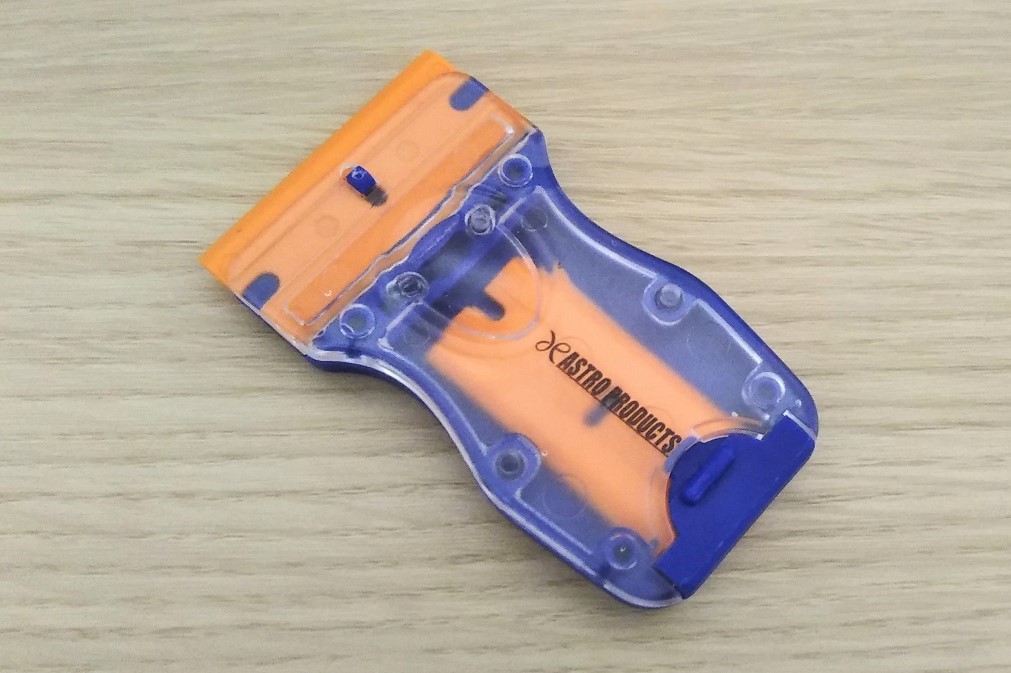 スクレーパーの刃は、プラスチックブレードだから素材にキズをつけにくいので安心です。ステッカー、のり剥がしはもちろん、水回りの白く固まった水垢、石鹸カスを削り落とせます。